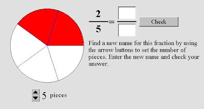 No 1.ºJOGO, deves escrever uma fracção (nos termos da fracção - rectângulos brancos) equivalente à refpresentada gráficamente e depois clicar no botão Check. Se a fracção estiver correcta (Yes), podes escrever uma nova fracção, equivalente às duas anteriores, ou clicar no botão New Fraction para outro exercício. (Também podes mudar o nº de divisões do círculo).